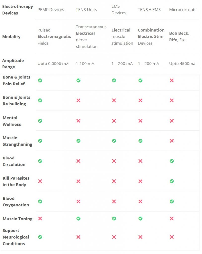 The chart below showcases the technological advancement of PEMF over rest of the Electrotherapy products. Microcurrent devices made with Rife , Bob Beck or Robert O Becker applications are the only ones have game changing features that PEMF devices don’t.